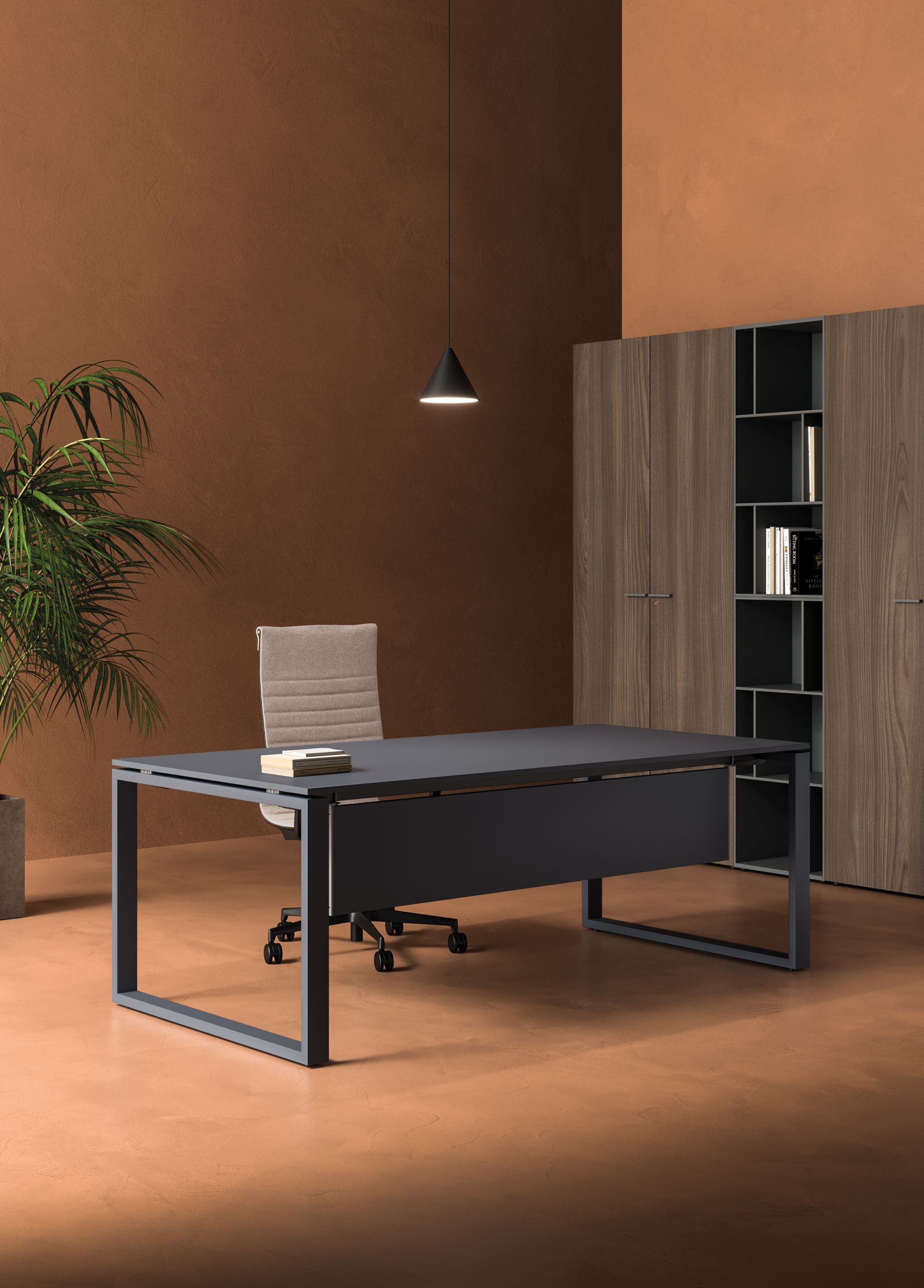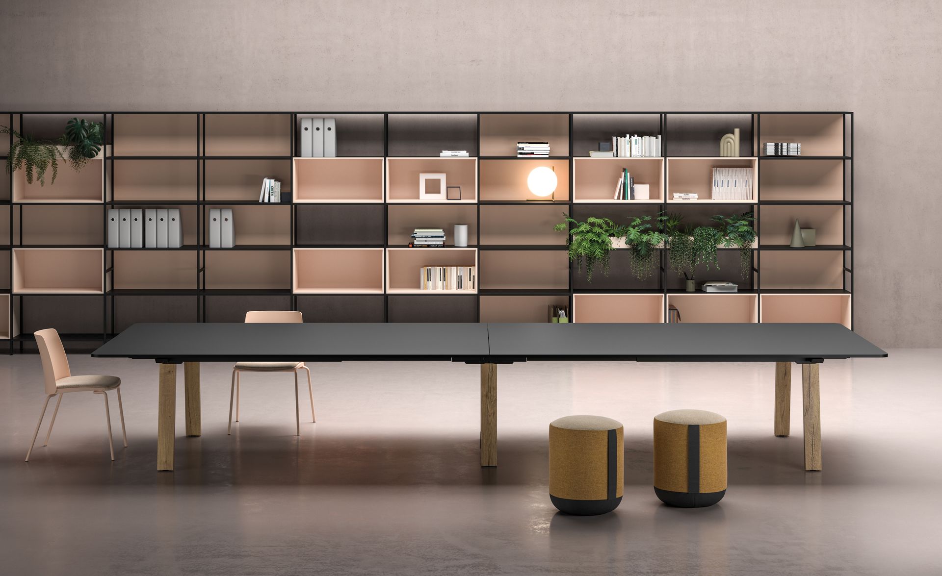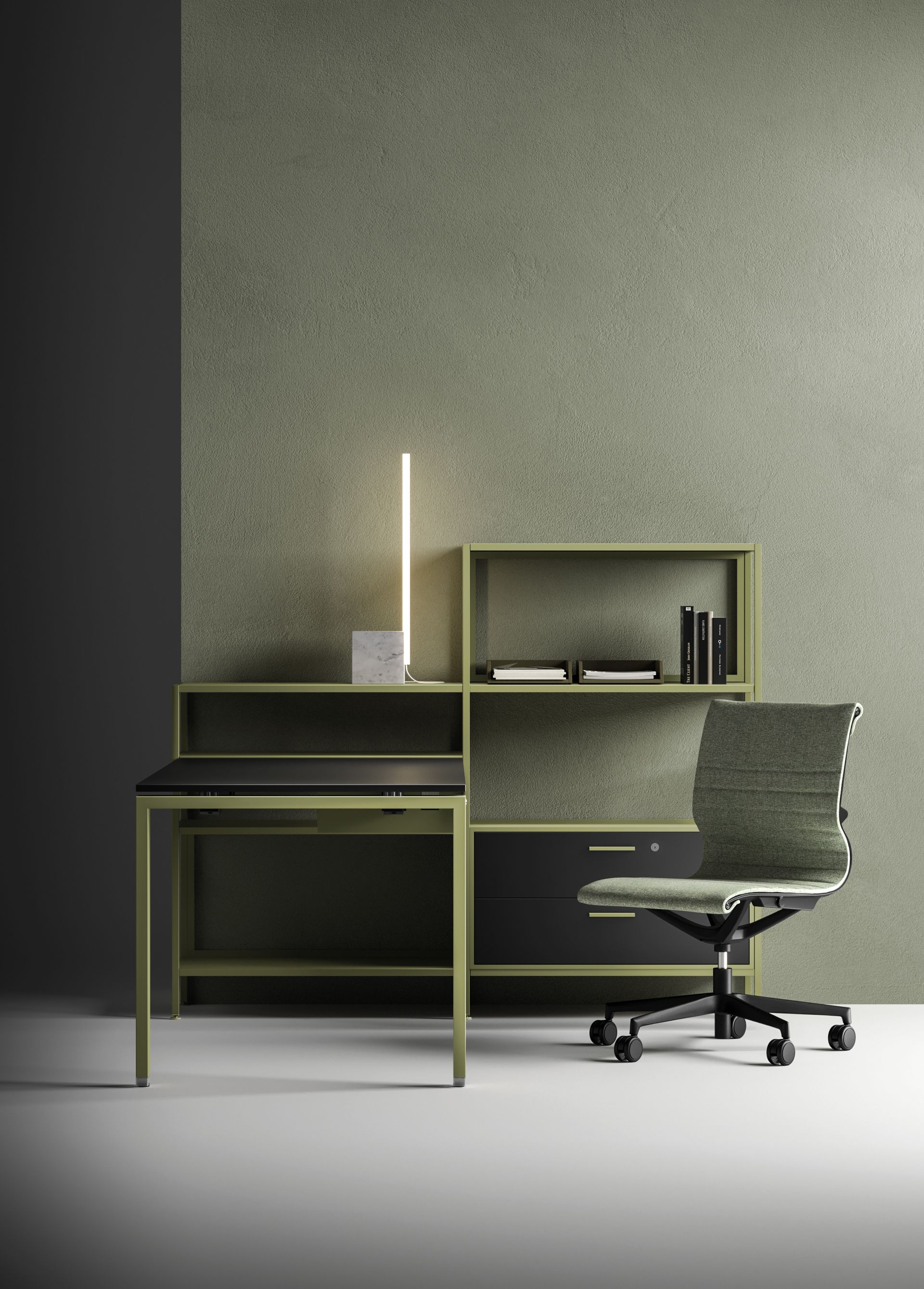 Eine Vielzahl an verschiedenen Farb- und Oberflächenkombinationen steht bei den Schreibtischen, Schrank- und Raumsystemen zur Verfügung.